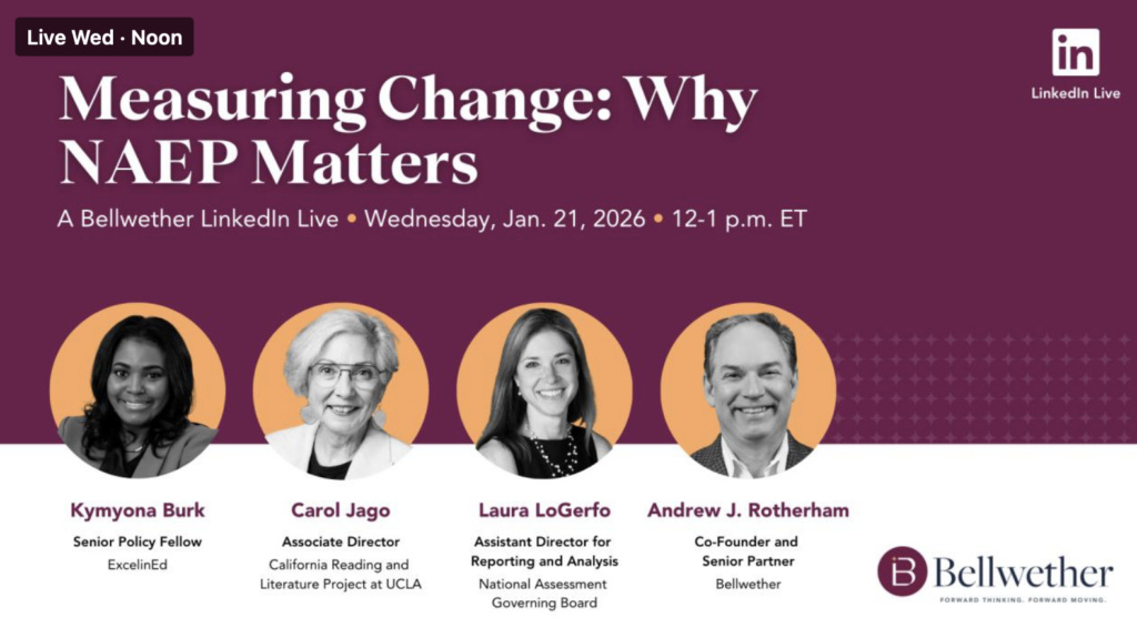 Tomorrow, Wednesday, join Bellwether at 12p ET for a LinkedIn Live conversation with insiders from NAGB and outside experts to discuss what’s happening on NAEP, why 12th-grade NAEP matters more than you might think, and why learning recovery still must be a front and center issue.